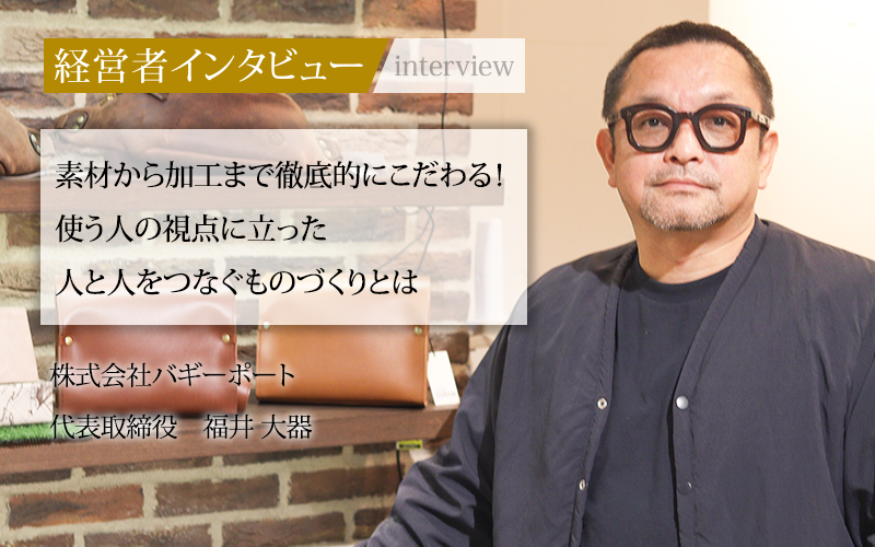 鞄業界でオリジナリティあふれる4つの自社ブランドを展開する株式会社バギーポート。アパレル業界からのOEM依頼を契機に新領域を開拓し、コロナ禍でもフランチャイズ展開を推進してきた。人と人とのつながりを大切にしたものづくりを行う、同社の代表取締役である福井大器氏に話をうかがった。