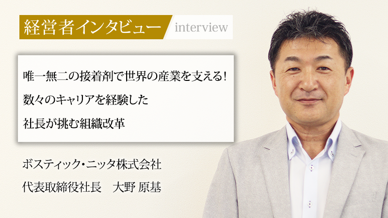 フランスの化学大手アルケマグループの中核を担うボスティックの合弁子会社であるボスティック・ニッタ株式会社。同社は、壁や天井に自在に張り付くヤモリをロゴに掲げ、世界基準のスマートな接着技術で日本の多様な産業を支える。代表取締役社長、大野氏のキャリアは変化の連続であった。研究職から未経験の営業へ、そしてアメリカ、上海などの海外赴任も経験しながら、常に変化をチャンスに変えてきた。その挑戦の軌跡と、会社を未来へ導く組織論に迫る。
