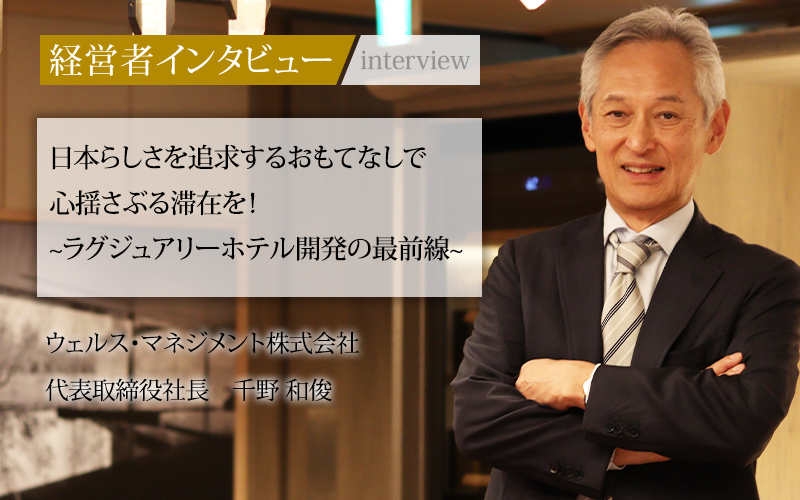 ラグジュアリーホテル開発事業を主軸に、日本の魅力と文化を「体験価値」として提供する、ウェルス・マネジメント株式会社。同社はグループ内に不動産開発事業を営むリシェス・マネジメント株式会社と、ホテル経営・運営事業を行うワールド・ブランズ・コレクション ホテルズ&リゾーツ株式会社、不動産投資運用事業を担うウェルス・リアルティ・マネジメント株式会社が一体となって不動産の取得・開発・運用・売却までを手がけている。日本の魅力を体現するホテルづくりに情熱を注ぐ、代表取締役社長の千野和俊氏に話をうかがった。