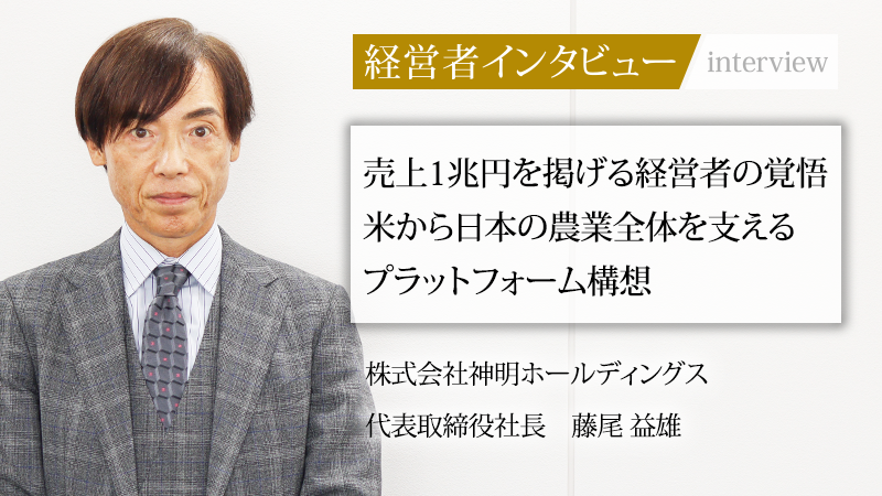 国内トップの米穀商社から、日本の農業全体を支える「農業のプラットフォーマー」へ。株式会社神明ホールディングスは、米事業を核としながら野菜や水産、外食までを手掛け、生産から販売までをつなぐ「アグリフードバリューチェーン」を推進する企業だ。担い手不足という課題に直面する日本の農業の未来を見据え、4代目として会社を率いるのが代表取締役社長、藤尾益雄氏である。祖父から受け継いだ帝王学を胸に、次なる売上目標1兆円を掲げる同氏の、日本の食と農業を守り抜くという熱い使命感に迫る。
