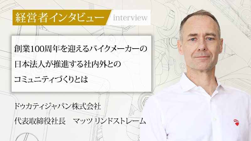 フォルクスワーゲングループの一員であり、2026年には創業100周年を迎えるイタリアのバイクメーカー、ドゥカティ。その日本法人であるドゥカティジャパン株式会社の代表取締役社長を務めるのが、スウェーデン出身のマッツ リンドストレーム氏だ。社内外で強固なコミュニティ形成に努める同社の事業哲学について、同氏に話をうかがった。