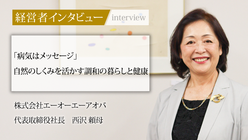西沢頼母/1959年東京都生まれ。日本女子大学卒業後、東京大学生産技術研究所にて教授秘書として勤務。1994年、株式会社エーオーエーアオバに入社。創業者・白井常雄氏の社長秘書として10年以上にわたり経営理念を学び、2002年取締役に就任。関連会社での環境事業を経て、2024年より代表取締役社長に就任。免疫療法、予防医療をベースとする日々の暮らし方や生き方の提案に注力している。