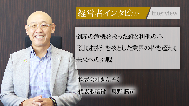 京都に拠点を置き、建設工事現場の測量事業で業界トップクラスの技術力を誇る株式会社きんそく。同社は、30年以上にわたり培ってきた「測る」技術を核に、近年は建設業界の課題を解決するシステム開発にも注力している。代表取締役の奥野勝司氏は、高校時代からの夢を叶え27歳で独立。しかしその道は平坦ではなく、親会社の経営不振による倒産の危機に直面した。その危機を、創業メンバーとの固い絆で乗り越えてきた。「盛和塾」での学びを機に「利他の経営」に目覚めた同氏に、その軌跡と未来への展望を尋ねた。