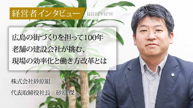 1924年の創業以来、株式会社砂原組は地元・広島の建設会社として「安心で住みやすい街づくり」をリードしてきた。今回、2016年に代表取締役社長に就任した砂原傑氏に、次の100年に向けて注力すべきテーマや現場の効率化、働き方改革について話をうかがった。