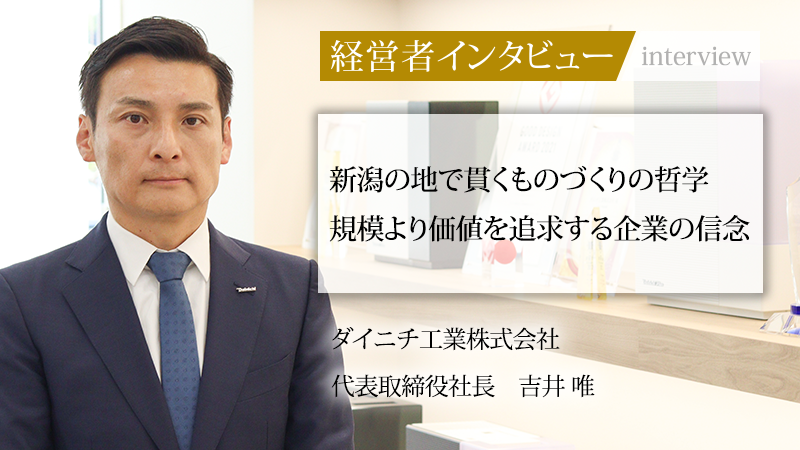 吉井唯/1976年、新潟県生まれ。立命館大学大学院理工学研究科修了。2014年にダイニチ工業株式会社へ入社。2017年に取締役経営企画部長、2019年に常務取締役管理本部長兼経営企画部長、2021年に代表取締役専務などを歴任。2022年6月、代表取締役社長に就任。