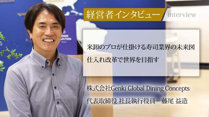「魚べい」や「元気寿司」ブランドで、国内外に店舗を展開する株式会社 Genki Global Dining Concepts。業界に先駆けて導入した“回転しない寿司”は、できたての鮮度と圧倒的な提供スピードで顧客の心を掴み、同社の成長を牽引してきた。2025年3月、この歴史ある企業の新たなリーダーとして就任したのが、米卸最大手・株式会社神明ホールディングスで多彩なキャリアを積んできた藤尾益造氏である。商社、食品メーカー、海外事業開拓と、食のサプライチェーンを川上から川下まで知り尽くす“仕入れのプロ”は、寿司業界にどのような変革をもたらすのか。その軌跡と未来への展望を聞いた。