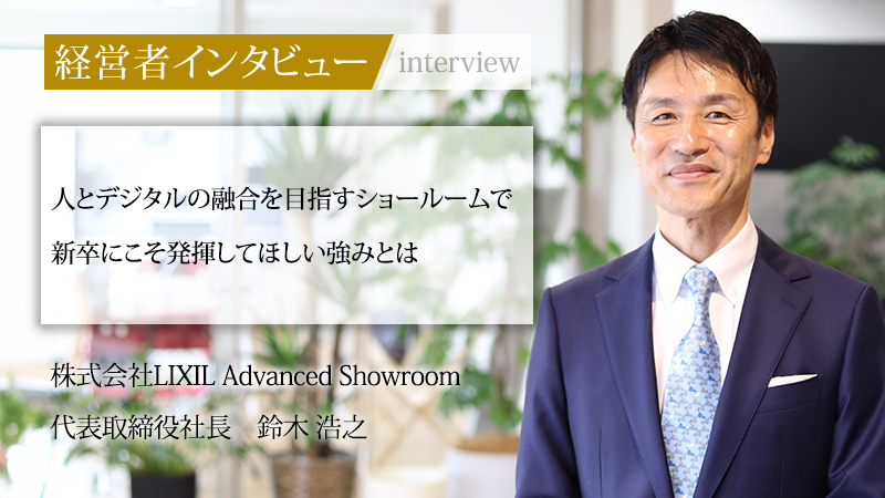 少子高齢化や働き方の価値観が変化する現代。企業には柔軟な組織づくりと多彩な人材の活躍が求められている。その課題に真正面から取り組んでいるのが株式会社LIXIL Advanced Showroomだ。希望者に限定した管理職や専門職への登用。毎月のアンケートによるコンディションサーベイ。9割を占める女性社員のライフステージに対応した諸制度。「お客さまの笑顔のために」というミッションの実現に向け、社員が笑顔で主体的に働ける環境を整えている。そんな同社が強みとしている「人にしかできない価値ある接客」と「デジタル」の融合とは何か。新卒社員に寄せる期待とはどのようなものか。代表取締役社長の鈴木浩之氏に話をうかがった。