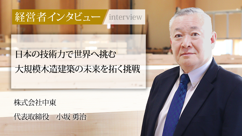 木質構造材である集成材やCLTの製造と、一般建築を担う地方ゼネコンという2つの顔を持つ株式会社中東。両部門が連携することで生まれる「現場を理解するメーカー」という強みを武器に、国内外で数多くの大規模木造建築を手がけている。30歳という若さで実質的に家業を継いだ代表取締役の小坂勇治氏に、これまでの歩みと木造建築の未来に向けたビジョンを聞いた。