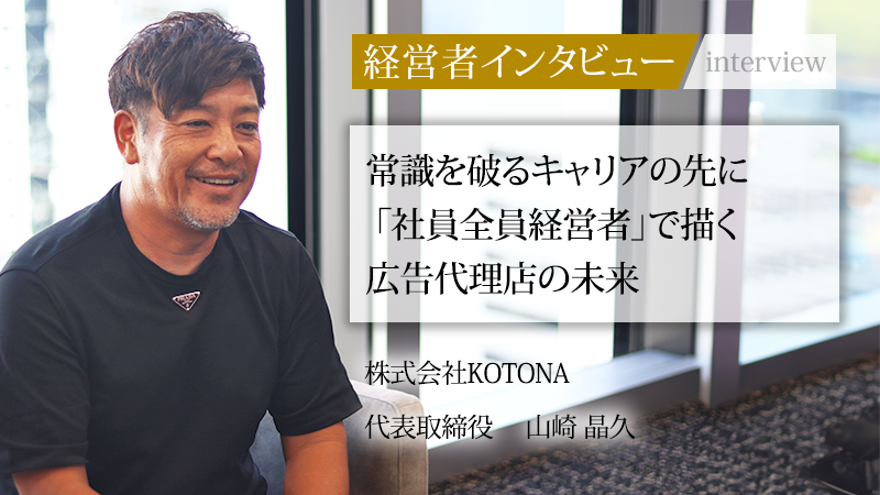 大阪を拠点に、リアルとWebの両面からクライアントの課題解決を支援する総合広告代理店、株式会社KOTONA。業界や規模を問わず、顧客のニーズに合わせた最適なソリューションを提供し、そのクリエイティビティとスピード感で独自の地位を確立している。同社を率いる代表取締役の山崎晶久氏は、野球一筋の学生時代から一転、海外放浪を経て広告業界へ飛び込んだ経歴を持つ。常に“常識を破る”ことを信条とし、独自の営業スタイルでキャリアを切り拓いてきた。山崎氏の波乱万丈なキャリアの軌跡と、社員一人ひとりが経営者となる未来を目指す独自の組織論、そして同社が描く広告代理店の新たな姿について話をうかがった。