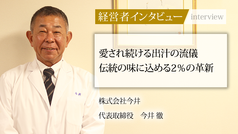 高校卒業後に単身で海外へ渡り、異文化の中で培われた「なんとかなる」という楽観の精神。それが、会社の存続を揺るがす危機に直面した際の大きな支えとなった。名店で学んだ「料理とは、客を料り理めるもの」という哲学を胸に、常にお客様と向き合う今井氏。伝統の味を守りながらも、時代に合わせた挑戦を続ける老舗の姿に未来への確かな力強さを感じた。