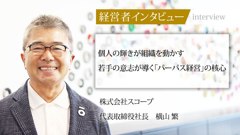 広告・プロモーション領域でクライアントの課題解決を支援する株式会社スコープ。同社は代表取締役社長の横山繁氏のもと、大きな変革の時代を迎えている。いかなる難題にも応える「実現力」を強みに、先代から続く「共存・共栄」の精神を企業文化の根幹に据え、社員一人ひとりの人生と仕事の融合を目指す「パーパス経営」を推進している。その重要なパーパス策定を若手に委ねるなど、大胆な風土改革を実行中だ。自身のモットー「眠っている時間以外は楽しく」を体現する横山氏が率いる同社はどこへ向かうのか。その軌跡と未来への展望を追った。