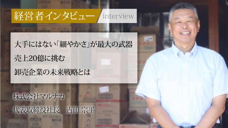 大阪府寝屋川市を拠点に、飲食店の食材や資材を届ける総合卸売業を営む株式会社マルナカ。大手にはない細やかな対応力を強みとする同社を率いるのが、代表取締役社長の吉田宗平氏だ。異業種から義父の会社へ入社し、後継者の重圧をバネに現場第一線で奮闘。しかし社長就任後に経験した自身の病気を機に、チームとして乗り越えるため、周りを頼る経営へと大きく舵を切った。旧来の体質から脱却し、次世代へ向けた組織改革を進める吉田氏に、その歩みと未来像について聞いた。