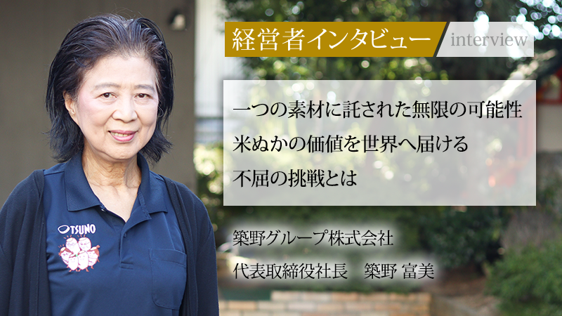 古くから日本人の生活に深く関わってきた「米ぬか」。その未知なる可能性を科学の力で切り拓き、高付加価値製品を生み出しているのが築野グループ株式会社だ。食品、化学、医療、化粧品と、その分野は幅広い。父から受け継いだ事業を世界的な企業へと成長させた代表取締役社長の築野富美氏。学生時代から家業に携わり、幾多の困難を乗り越える原動力となった「米ぬかに夢を」という言葉に込められた思いと、会社の未来像について話を聞いた。