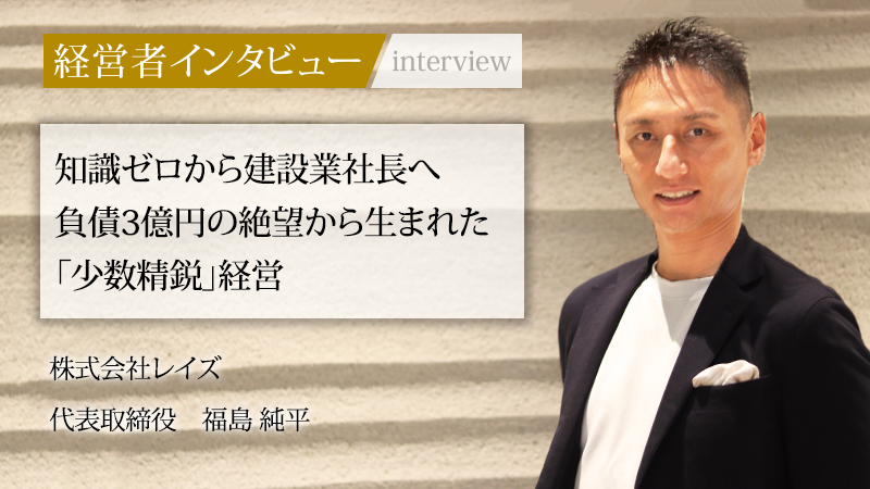 大手ゼネコンのパートナーとして、高速道路や地下鉄、ダムといった日本の大動脈を支える公共インフラ工事を手がける株式会社レイズ。従業員数が20名規模ながら、大規模プロジェクトに参画できる高い技術力と、安定した財務基盤を誇る。同社を率いる代表取締役の福島純平氏は、19歳で父となり、家族を養う一心で建設の世界に飛び込んだ人物だ。リーマンショックで3億円もの負債を抱え倒産の危機に瀕するも、東日本大震災の復興事業を機に奇跡のV字回復を達成。逆境を乗り越えた経験から導き出された独自の経営哲学と、今後の展望について話をうかがった。