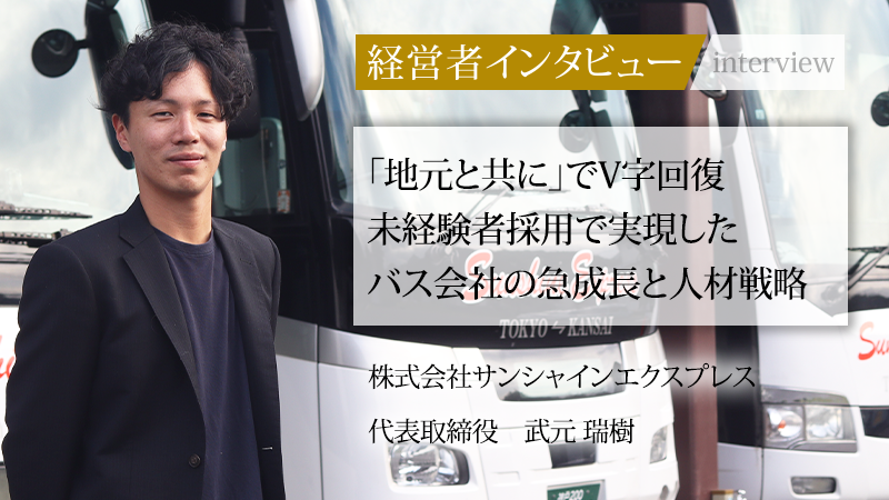 兵庫県丹波篠山市に拠点を置き、関西と東京・九州を結ぶ高速夜行バス事業を展開する株式会社サンシャインエクスプレス。コロナ禍の経営危機を乗り越え、業界の常識を覆す採用力と育成術を武器にV字回復を遂げた。「地元篠山と共に、社会に必要とされ続ける企業となる」という目標を掲げ、運輸事業を通じて地域社会の発展にも貢献している。同社を率いる代表取締役の武元瑞樹氏は予期せず事業を承継し、いかにして会社を再建したのか。苦境から這い上がった組織改革の裏側と、地域と共に描く未来像に迫る。