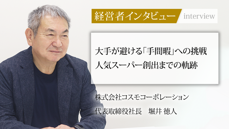 京都府を拠点に、地域住民の食生活を支えるスーパーマーケット「新鮮激安市場!」を展開する株式会社コスモコーポレーション。圧倒的な鮮度と品揃えを誇る生鮮食品を武器に、顧客から絶大な支持を得ている。同社を率いる代表取締役社長の堀井徳人氏は、鮮魚担当としてのキャリアで培った審美眼と現場主義を貫き、独自の店舗モデルを確立した。倒産の危機や先代経営者との対立。幾多の困難を乗り越え、人気店をつくりあげた同氏の歩みと経営哲学に迫る。