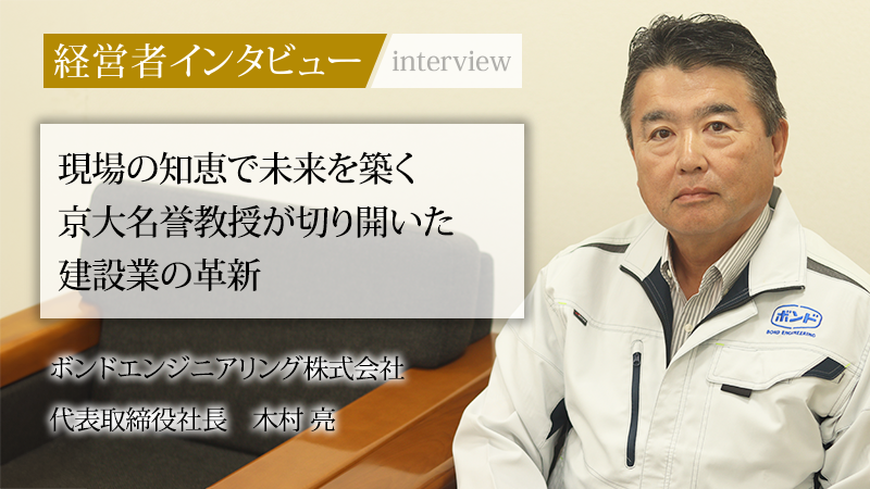 大阪に拠点を置くボンドエンジニアリング株式会社は、橋梁やトンネル、コンクリートや鋼構造物の維持管理や耐震補強を手がける企業だ。構造物の安全を保ち、人々の暮らしを守る事業を展開する同社の舵取りを担うのが代表取締役社長の木村亮氏だ。稀有な京都大学名誉教授から経営者への転身は、一体何を求めての決断だったのだろうか。大学教授として長年研究と人材育成に尽力し、現在は建設業界に新たな風を吹き込む木村氏のこれまでの歩みと、その思いに迫る。
