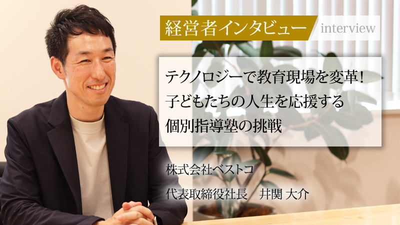 日本の教育現場は、集団授業が主流だった時代から、子どもたち一人ひとりに寄り添う個別指導が広がりを見せるなど、そのあり方は多様化している。そんな中、従来の教育業界が抱える働き方や学習方法の課題に真正面から向き合い、地域に根差した個別指導塾「ベスト個別」を展開するのが、株式会社ベストコだ。代表取締役社長の井関大介氏は、集団授業では成績が伸びにくい生徒を個別にフォローしたいという思いから、33歳で起業した。地域に貢献し、子どもたちの人生を応援するという揺るぎない信念を持つ同氏に話を聞いた。