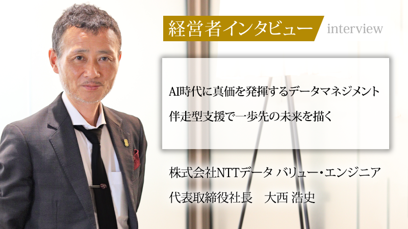 株式会社NTTデータ バリュー・エンジニアは、データの整備・維持から活用までを担い、顧客業務に直結する成果を上げてきた。代表取締役社長の大西浩史氏は、NTTデータ時代の購買部門での体験から、2001年に社内ベンチャーを創業。一般社団法人日本データマネジメント・コンソーシアム(JDMC)を設立したほか、資格制度の創設に働きかけるなど、業界全体を牽引する存在だ。データマネジメントで第一線を走り続ける同氏に、これまでのキャリアや今後の展望についてうかがった。