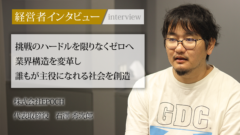 株式会社大創産業(DAISO)のリブランディングをはじめ、数々の企業のプロモーションを手がける株式会社EPOCH。デジタル、映像、グラフィックの垣根を越えたクリエイティブで、プロモーション業界に確かな実績を刻んでいる。同社を率いる代表取締役の石澤秀次郎氏は、一度はクリエイターの道を志すも挫折し、インターネット業界へ転身。「挑戦する人の障壁を取り払い、失敗しても再起できる社会のインフラを創りたい」。と語る石澤氏の、その事業観に迫る。