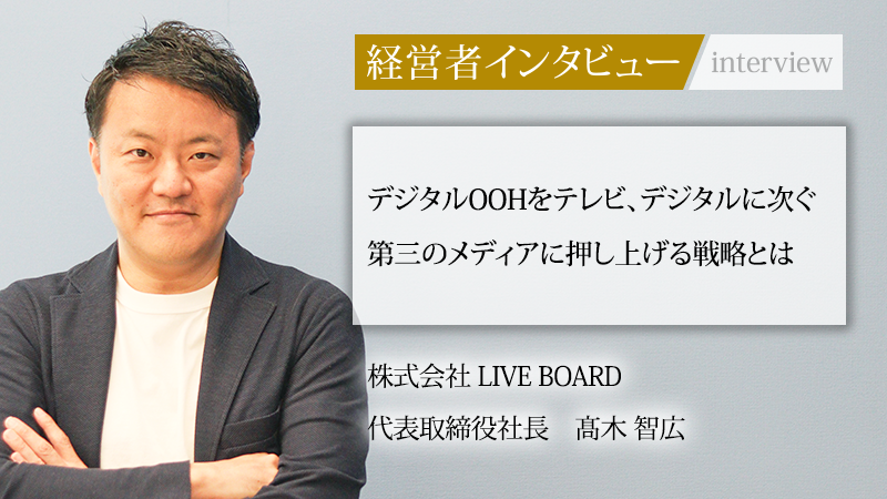 新型コロナウイルスの影響で人々の生活様式が大きく変化し、広告業界もデジタル化の加速に直面した。特に、OOH(※1)広告は、データを活用した精緻なデジタルOOHメディアへと進化しつつある。そうした潮流の中で、注目を集めるのが株式会社 LIVE BOARDの取り組みだ。同社はNTTドコモと電通グループ、博報堂の合弁会社である。2025年に代表取締役社長へ就任した髙木智広氏に、事業の特徴や今後の展望をうかがった。
