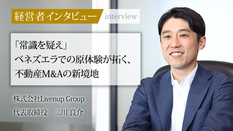 不動産の開発・分譲を主軸としながら、M&Aによる事業承継を独自の強みとして成長を続ける、株式会社Livenup Group。現在は“第二創業期”を掲げ、IPO(新規株式公開)を見据えて組織の変革を加速させている。同社を率いるのは、代表取締役の二川良介氏。幼少期をベネズエラで過ごし、金融業界を経てトップに就任した異色の経歴を持つ。彼の原体験からくる「常識を疑う」という視点は、会社の成長戦略そのものに深く根差している。