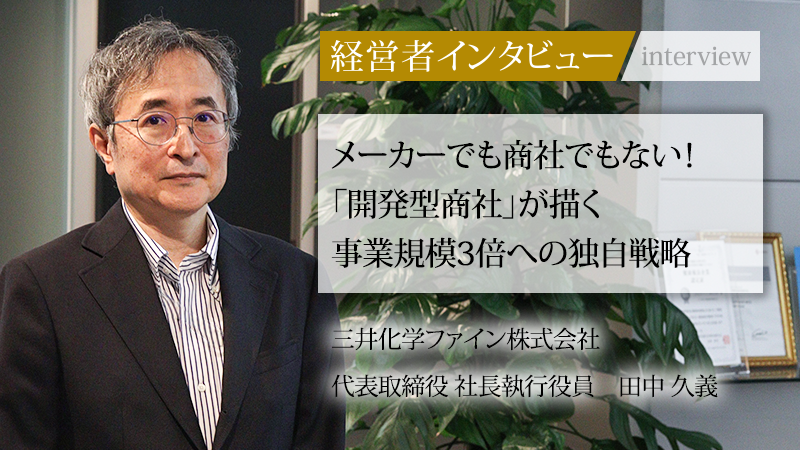 数々の事業再構築という難局を乗り越えてきた田中氏。その経験から導き出されたのは、明確な戦略と組織力の重要性という揺るぎない信念である。「ファインケミカルコンソーシアム」という壮大な構想を語る言葉には、日本の化学産業の未来を切り開こうとする強い意思が宿る。メーカーと商社の強みを融合させた独自のビジネスモデルを武器に、同氏が率いる三井化学ファインがこれからどのような飛躍を遂げるのか、その挑戦から目が離せない。