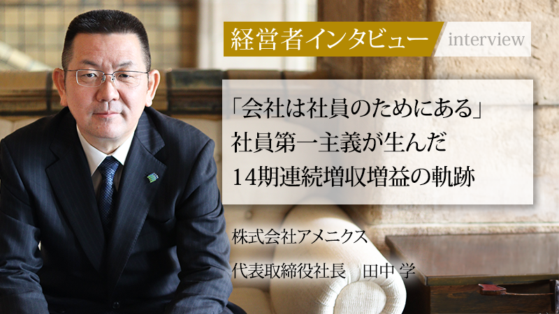 長野県に根差し、エクステリア資材の卸売事業で県内トップシェアを誇る株式会社アメニクス。同社を率いるのは、高校卒業後に業界へ飛び込み、現場の第一線でキャリアを築き上げてきた田中学氏である。「会社は社員のためにある」という強い信念のもと、年間休日120日や業界高水準の初任給など、旧来の慣習にとらわれない“社員ファースト”の経営を実践。リーマン・ショック後の苦境を乗り越え、従業員11名からの再出発を経て、14期連続での増収増益という目覚ましい成長を成し遂げた。なぜ社員を大切にすることが、企業の揺るぎない強さにつながるのか。その独自の経営哲学と、社員と共に描く未来についてお話をうかがった。