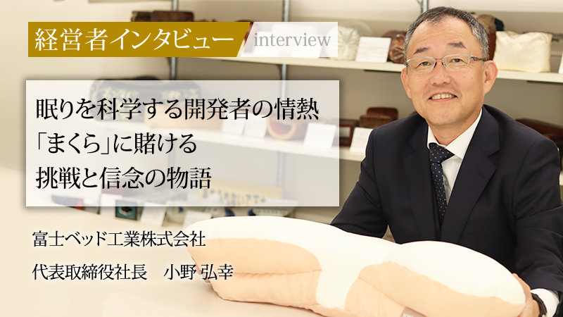 快適な「眠り」を届けることを使命に、今年で創業69年目を迎える寝具メーカー、富士ベッド工業株式会社。創業当初はマットレス製造販売が中心であったが、後に枕の生産を開始し、日本初の機能枕「ツーウェイピロー」を考案し実用新案登録している。社名に「ベッド」と冠しながらも、その事業の柱は一貫して「枕」であり、機能枕のパイオニアとしても知られている。