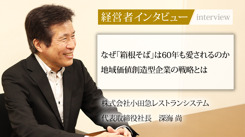 特に「箱根そば」は今年で60周年を迎え、長年にわたり地域住民の「ソウルフード」として親しまれている。同社を率いる代表取締役社長の深海尚氏は、小田急電鉄で経理、人事、執行役員を経験し、現職に就任。「全店舗のソウルフード化」、DX戦略、人材戦略、新規出店という4つの注力テーマを掲げ、同社の更なる成長を目指している。深海氏のキャリアパス、会社の強み、そして地域価値創造型企業として描くビジョンについて詳しく話をうかがった。