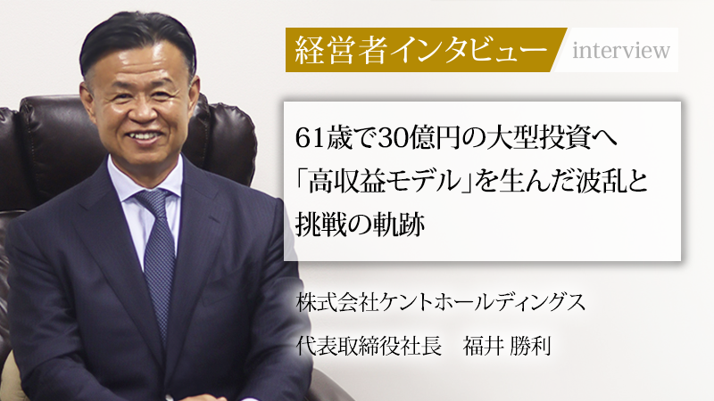 福井勝利/1998年6月に有限会社建都興産を創業。2005年5月に有限会社ケントホームを、同年6月には株式会社ケントコーポレーションを設立。2011年9月に株式会社賃貸保証サービスを設立、同年10月介護事業会社 株式会社ケントメディカルケアを設立。2019年訪問看護・訪問リハビリ事業を開始し、株式会社ナーシングケアサービスを設立。2020年1月有限会社友愛を子会社化。
