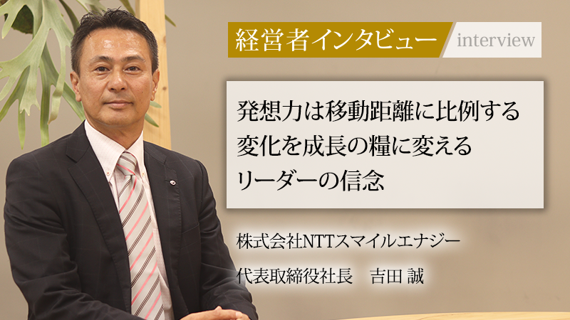 太陽光発電設備の遠隔監視サービス「エコめがね」を主力に、再生可能エネルギーの普及を支える株式会社NTTスマイルエナジー。全国約12万件の導入実績を誇り、再生可能エネルギーを誰もが安心してかしこく使える社会の実現を目指す。2025年6月、同社の代表取締役社長に就任したのが吉田誠氏だ。NTT入社後、国内外で転勤を繰り返しながら多様な経験を重ね、「発想力は移動距離に比例する」という信念を培ってきた。目の前の仕事をとことん楽しむ「働楽」の精神を胸に、同社をどう率いていくのか。その軌跡と展望に迫る。