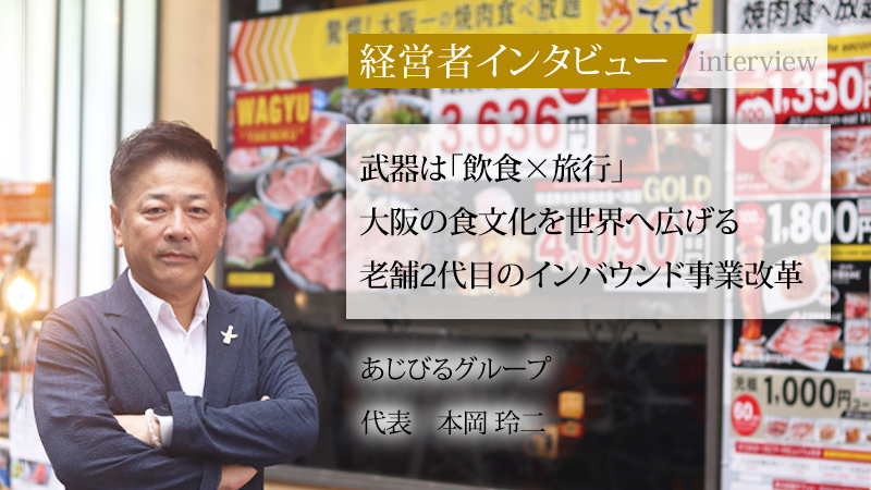大阪を拠点に、「ぶっち切り寿司 魚心」「黒毛和牛とホルモン 焼肉でっせ」などの飲食店を57年にわたり展開するあじびるグループ。同社は飲食事業に留まらず、訪日外国人観光客向けの旅行事業も手掛けるユニークな企業である。建築業界での経験を経て家業に戻った、2代目社長の本岡玲二氏。東京進出の失敗やコロナ禍での売上ゼロといった、幾多の苦難を乗り越えてきた。