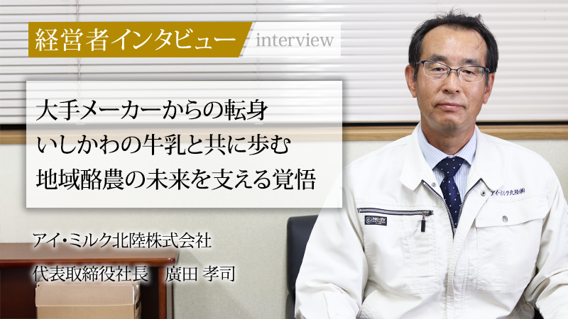 石川県に根差し、「いしかわ生まれ、いしかわ育ち」を掲げて地域社会と共に歩むアイ・ミルク北陸株式会社。地元の酪農家が生産した生乳にこだわり、安全・安心でおいしい牛乳を食卓に届け続けている。大手電子部品メーカー「村田製作所」でのキャリアを経て、家業を継ぐためにUターンした代表取締役社長、廣田孝司氏に、予期せぬ形で始まった経営者の道、品質管理の徹底と新工場建設という改革、そして地域に必要とされる会社であり続けるための経営における信条をうかがった。