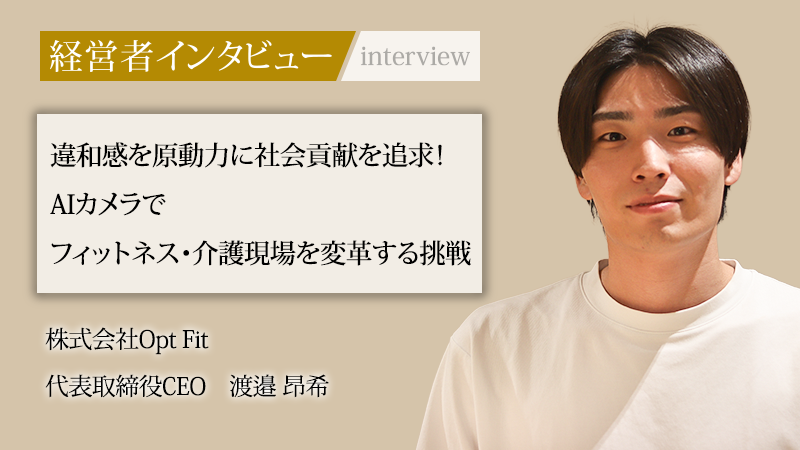 少子高齢化による労働人口の減少が社会課題となる中、AI技術で現場のDXを推進する株式会社Opt Fit。フィットネスジムや介護施設に特化したAIカメラソリューションを提供し、無人・省人運営を低コストで実現することで急成長を遂げている。代表取締役CEOの渡邉昂希氏は、大学まで水泳一筋で社会人経験すらない状態からITの世界へ。一度は立ち上げた事業に「人の役に立っていない」という違和感を覚え、現在の事業へとピボットさせた。その挑戦を支える原動力に迫る。