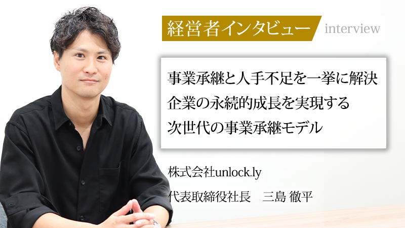 事業承継と人手不足という日本が抱える根深い課題の解決に挑む、株式会社unlock.ly。同社はM&A(※1)による事業承継支援と、人材紹介といったHR支援を両輪で展開し、企業の潜在能力を解き放つ(アンロックする)独自のモデルを築いている。商社、コンサル、投資ファンドと多彩なキャリアを歩んだ代表取締役社長の三島徹平氏に、創業の経緯や会社の未来像について話を聞いた。
