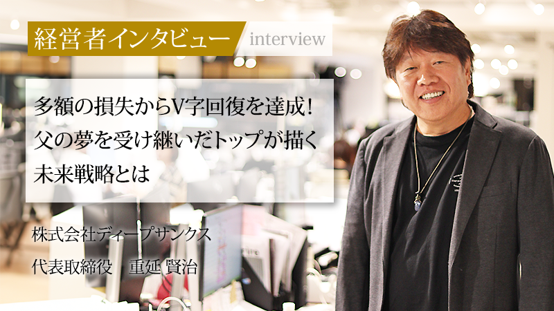20〜35歳向けのレディースアパレルを主軸に、企画から販売までを手がける株式会社ディープサンクス。ODM(※)による企画力とスピードを強みとし、近年はZOZOでのネット販売も大きく伸長させている。代表取締役の重延賢治氏は、アパレル業界で多彩な経験を積んだ後、39歳で独立。順調な成長のさなかに直面した6億円の損失という危機を、「ガラス張りの経営」によって乗り越えた。その波乱万丈な歩みと経営哲学について話を聞いた。