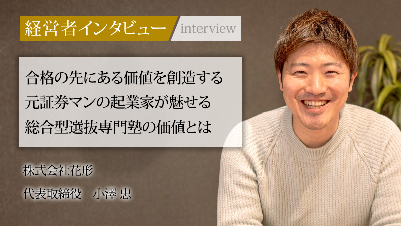 年収3000万円という華々しいキャリアと安定を捨て、株式会社花形を創業した代表取締役の小澤忠氏。同社は、総合型選抜(旧・AO入試)に特化した学習塾「AOI」を運営。生徒一人ひとりの個性と向き合い、主体性を引き出す教育を追求する企業だ。今回は、小澤氏が歩んできた道のりと、その根底にある教育への思い、そして未来への展望を深掘りする。