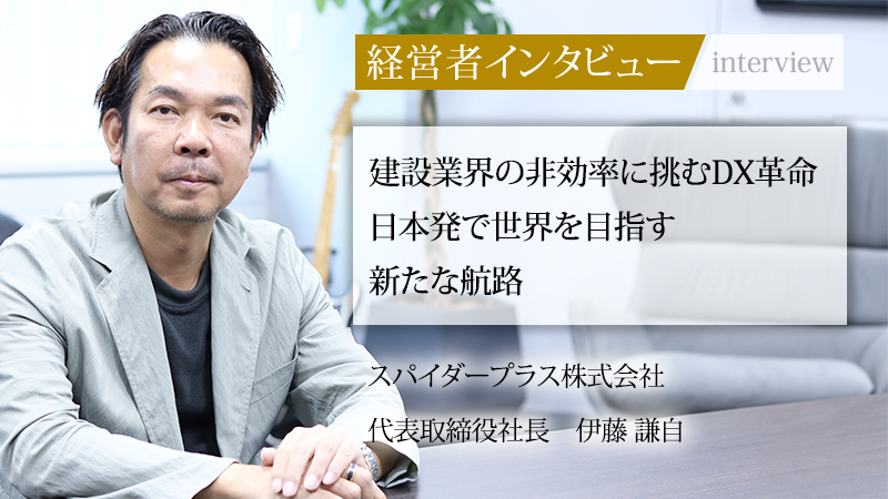 建設現場のDX(デジタルトランスフォーメーション)を力強く牽引するスパイダープラス株式会社。同社が開発した図面管理・情報共有システムは、業界の非効率を解消する革新的なツールとして、多くのゼネコン(総合建設業者)や専門工事業者に導入されている。同社を率いるのは代表の伊藤謙自氏だ。今回は、逆境を乗り越えた秘話、そして世界を目指す未来像まで、その情熱と経営論に迫る。