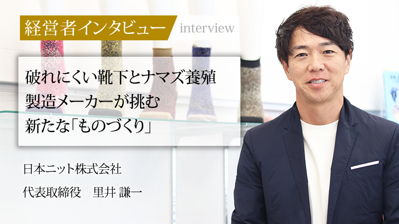 奈良県で創業85年の歴史を持つ靴下製造メーカー、日本ニット株式会社。低価格の海外製品との競争が激化する現代において、「日本のものづくり」と「地域の雇用」を守ることにこだわり、革新的な挑戦を続ける。売上至上主義ではない経営を掲げる同社は、自社ブランドの成功だけでなく、一見畑違いに思えるナマズの陸上養殖事業も展開している。家業を継ぐまでの道のり、そして未来を見据えた挑戦の背景にある思いを、三代目社長、里井謙一氏にうかがった。