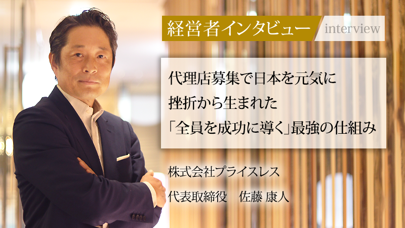 代理店募集に特化したWebサイト「代理店ドットコム」を運営し、数多くの企業の事業拡大を支援する株式会社プライスレス。同社の代表取締役を務める佐藤康人氏は、営業職での挫折を経て33歳で独立。「日本で唯一の代理店構築コンサルタント」として独自の道を切り拓いた。自身の苦しい経験から生まれた「不幸な人を一人もつくらない」という信念を胸に、知られざる巨大市場に挑む同氏に、その軌跡と事業にかける思いをうかがった。