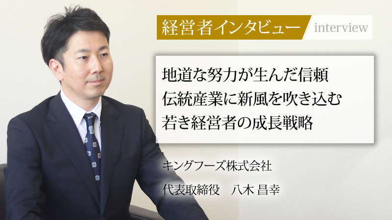 新卒で入社した会社で一筋にキャリアを重ね、若くして社長になる夢を実現した八木氏。その道のりは、深い製品知識、顧客との誠実な向き合い、そして継続する力といった地道な努力の積み重ねだ。さらに同氏は、伝統的な食材を扱いながらも常に未来を見据え、生産体制の強化や新商品開発にも意欲的である。その姿は、多くのビジネスパーソンにとって示唆に富む。同氏の誠実な人柄と静かな情熱に触れ、キングフーズのさらなる飛躍に大いに期待したい。