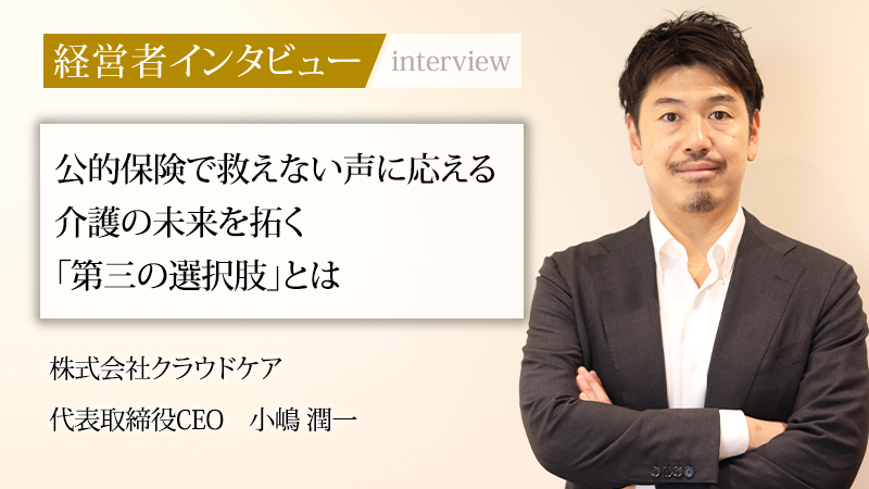 介護保険の適用範囲外の領域に特化し、介護を必要とする人とヘルパーをつなぐマッチングプラットフォーム「クラウドケア」。同社は、利用しやすい価格設定と、働き手のやりがいを追求した独自の仕組みを強みに、業界のパイオニアとして成長を続けてきた。創業以来変わらぬビジョンを掲げ、介護の新たな形を模索する代表取締役CEOの小嶋潤一氏に、事業の背景と今後の展望について話を聞いた。