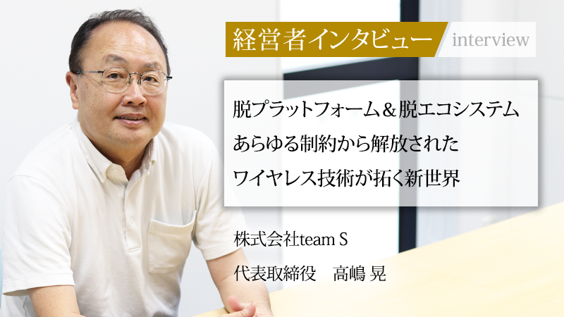 脱プラットフォーム(OSに依存しない)、そして脱エコシステム(どのようなOS、どのメーカーの端末とつながる)の独自ワイヤレス動画転送技術「SSE」を開発し、世界のITインフラに変革をもたらそうとしている株式会社teamS。かつて電子書籍事業を手がけた代表取締役の高嶋晃氏は、顧客が抱いた「なぜスマホがあるのにスマホの画面を大きくしたタブレット(回路などはスマホと同じ)も必要なのか」という素朴な疑問を起点に、世界にありそうでなかった世界初の開発に挑んでいる。そこには「楽しいところに人と金は集まる」という独自の経営論と、運命的な人との出会いの物語があった。常識を覆す技術の核心と、同社が描く未来のビジョンに迫る。