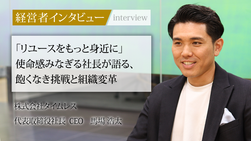 リユース業界の健全化と透明性の向上を掲げ、急成長を遂げる株式会社タイムレス。2024年に代表取締役社長 CEOに就任した馬場浩太氏は、10人規模の小さな会社から400人規模の企業へと成長させた立役者の一人だ。業界内で唯一無二のワンストップモデルを構築。参画が難しいといわれる百貨店への出店を拡大するなど、常に革新的な取り組みを続けてきた。リユースをより身近で安心できる業界にするため、どのような戦略と理念で事業を展開しているのか、詳しく話を聞いた。