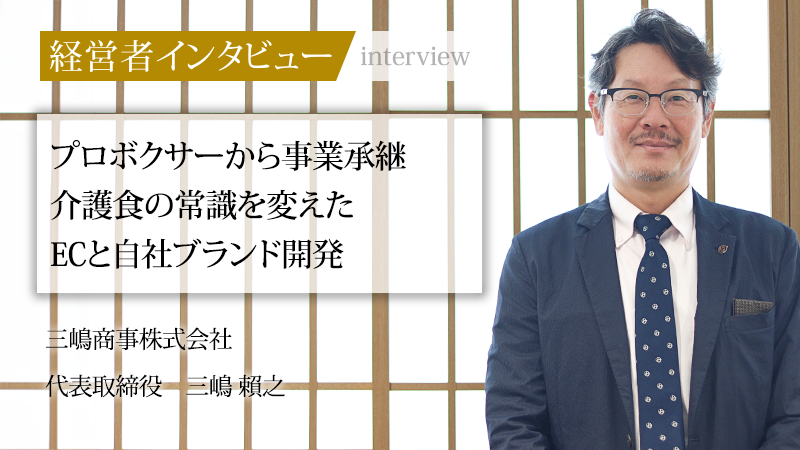 大阪府堺市に拠点を置く、治療食・介護食の専門商社、三嶋商事株式会社。40年以上の歴史を持つ卸売事業に加え、ECサイト運営やプライベートブランド(PB)商品の開発で成長を続けている。代表取締役の三嶋賴之氏は、プロボクサーからの転身、そして父の急逝という予期せぬ形で事業を継承した。苦境から会社を5倍以上の規模に成長させた同氏に、これまでの軌跡と今後の展望について聞いた。