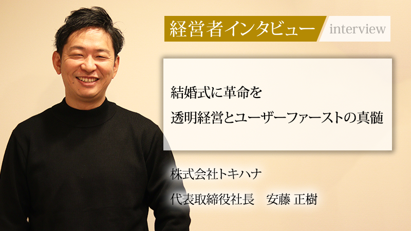 ブライダル関連のプラットフォーム事業や、結婚式場向けコンサルティング、人材紹介サービスなどを展開する株式会社トキハナ。LINEを活用したパーソナルな相談対応に加え、「持ち込み自由」「即決不要の最低価格保証」といった独自のサービス設計で、不透明さが課題とされるブライダル業界に革命を起こしている。徹底したユーザーファーストにより、式場側とも良好なパートナーシップを築く同社は、コロナ禍の苦境もバネに成長を続ける。同社を率いるのは、上場企業2社の成長に貢献した経験を持つ代表取締役社長の安藤正樹氏。なぜあえてレッドオーシャンと言われるブライダル業界で起業したのか。その熱い思いと、徹底した透明性経営の真髄に迫る。