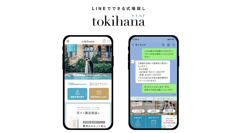 弊社の主力事業は、新郎新婦と結婚式場をオンラインでマッチングするサービス「トキハナ」です。最大の強みはユーザーファーストを徹底している点です。式場探しをLINEでできるという利便性に加え、「持ち込み自由」「即決不要の最低価格保証」を約束する式場のみを紹介しています。特に、通常は制限の多い「持ち込み」を7割以上の提携式場がOKとしているのは、業界内でも革命的な成果だと自負しています。