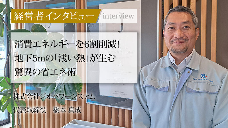 山口県に拠点を置く株式会社ジオパワーシステムは、地中の熱エネルギーを利用した独自の換気・空調システムを開発・提供する企業である。年間を通して温度が安定している深さ5m前後の「浅い地中熱」に着目し、汎用的な重機で施工できる画期的な工法を確立した。これにより、コストを抑えながら、省エネと健康的な室内環境の両立を実現している。住宅用で培ったノウハウを活かし、近年では工場の暑さ対策や公共施設など非住宅分野へも事業を拡大している。その独自性と将来性から注目を集める同社の代表取締役の橋本真成氏に、システムの革新性や今後の展望について話を聞いた。