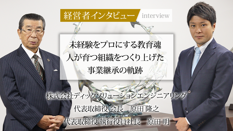1984年の創業以来、40期連続黒字という盤石な経営基盤を誇る株式会社ディックソリューションエンジニアリング。電気制御と情報通信という二つのインフラ技術を軸に、社会の根幹を支え続けている。同社の強みは、創業時からの「技能」を時代の変化に合わせて「技術」へと昇華させ、さらに未経験者を短期間でプロのエンジニアへと育成する独自の教育システムにある。今回、同社を築き上げた会長の原田隆之氏と、そのバトンを受け継いだ二代目社長の原田明氏に、事業承継の舞台裏と、同社が目指す「技術と心」の継承について話を聞いた。